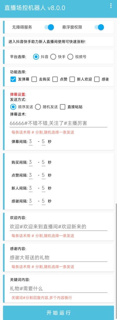 场控助手app安卓版分享给大家,非常实用的一款直播间互动神器,支持抖音、快手、视频号,提供弹幕自动发送、点赞、新人欢迎、感谢送礼等功能,非常好用的场控工具
